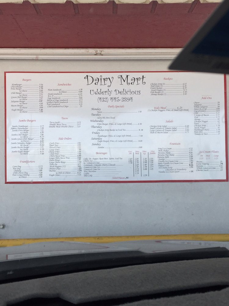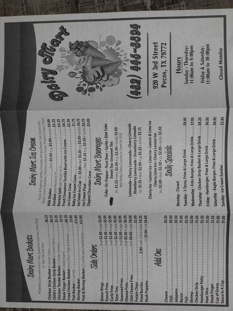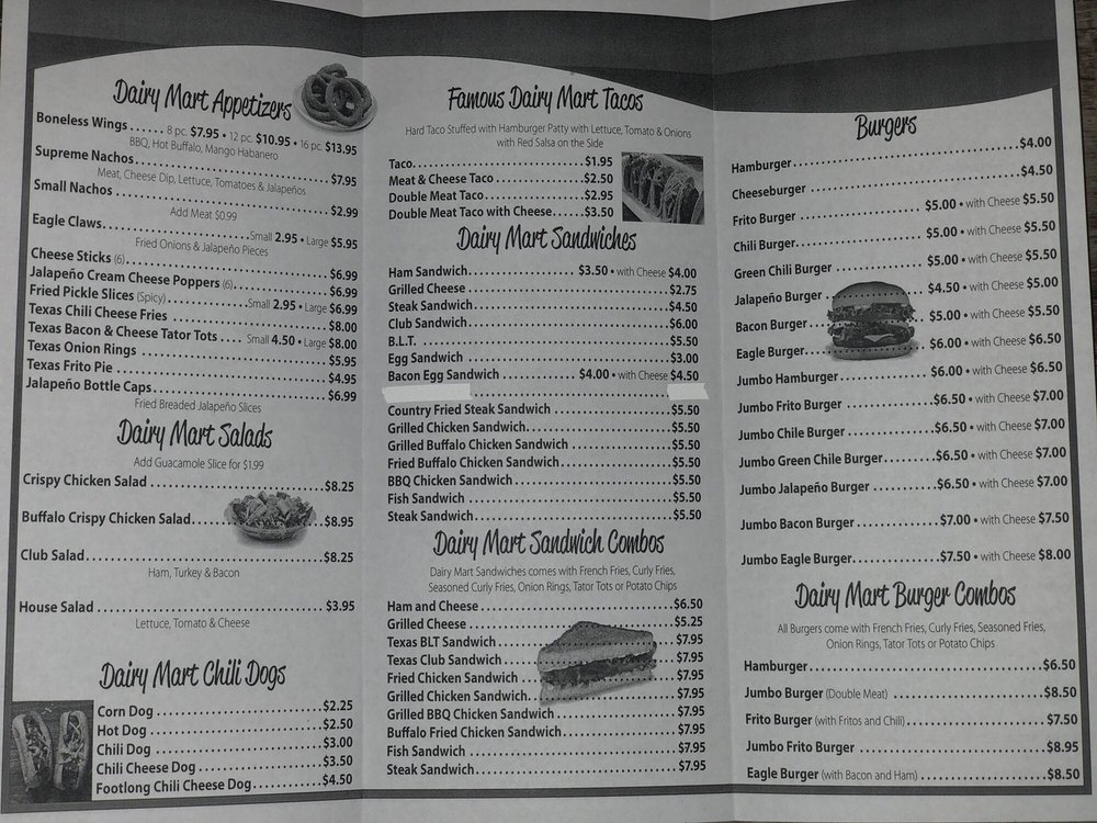 Dairy Mart is a distinctive restaurant located in the heart of the United States, renowned for its fusion of traditional Mexican cuisine with a modern twist. This family-owned business takes pride in its rich heritage, tracing its roots back to the Mexico ethnic tribe. Dairy Mart's menu offers a dynamic blend of flavors, featuring a variety of dairy products, fresh produce, and authentic Mexican spices. From traditional dishes like enchiladas and tacos to innovative creations like Mexican-style pizzas and quesadilla burgers, Dairy Mart caters to the tastes of both the adventurous and the conventional food lovers. Known for their excellent customer service and ambiance, they have become a favorite dining spot for locals and tourists alike.