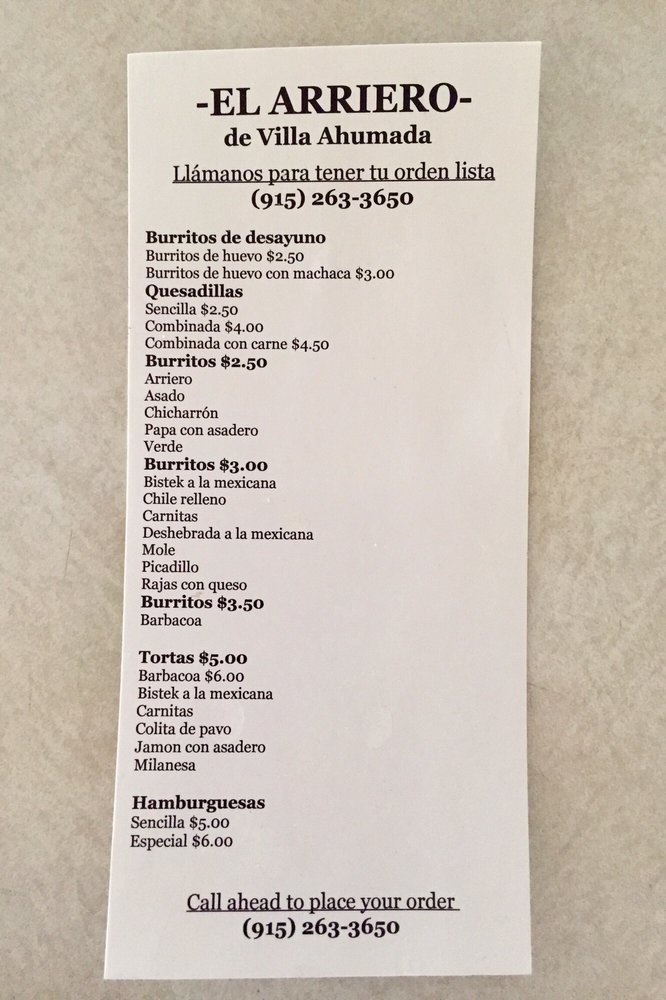 El Arriero De Villa Ahumada is a renowned restaurant located in the heart of the United States, dedicated to offering an authentic Mexican culinary experience. As a pillar in the restaurant industry, they specialize in traditional Mexican cuisine, blending unique flavors and techniques that have been passed down through generations. Their menu encompasses a wide range of dishes, from tantalizing tacos and enchiladas to mouth-watering mole and chiles rellenos. All meals are freshly prepared using high-quality ingredients, ensuring that every bite delivers the rich flavors and textures that Mexican food is celebrated for. El Arriero De Villa Ahumada is also known for its warm and inviting atmosphere, making it a perfect spot for family gatherings, casual dining, or special occasions.