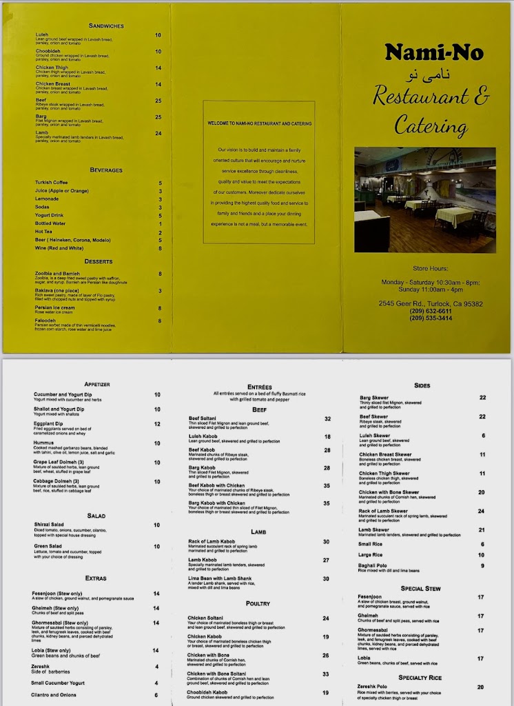 Situated in the heart of California, Nami-No Restaurant & Catering is an exquisite culinary destination that pays homage to the rich and diverse heritage of Iran/Persia. This establishment is not just a restaurant; it's a vibrant hub where the community comes together to share in a cultural dining experience. The brilliance of Persian cuisine is showcased through an array of dishes that are as flavorful and aromatic as they are nutritious. Each dish is a testament to the age-old traditions and culinary techniques of the ethnic tribe, with a modern twist that appeals to a broad range of palates. But Nami-No's uniqueness goes beyond its mouth-watering food. The restaurant offers an immersive customer experience, where patrons are whisked away on a culinary journey through Iran/Persia, all from the comfort of their own table. The décor is tastefully done, reflecting Persian aesthetics, creating an ambiance that is both exotic and comforting. In addition to serving customers at the restaurant, Nami-No also provides a top-notch catering service, bringing the vibrant flavors of Persian cuisine right to your doorsteps for any occasion. By doing so, they are not just serving food, but also fostering a deeper understanding and appreciation for the Persian culture within the community. Whether you're a longtime fan of Persian cuisine or new to its delights, Nami-No Restaurant & Catering promises a unique and memorable dining experience.