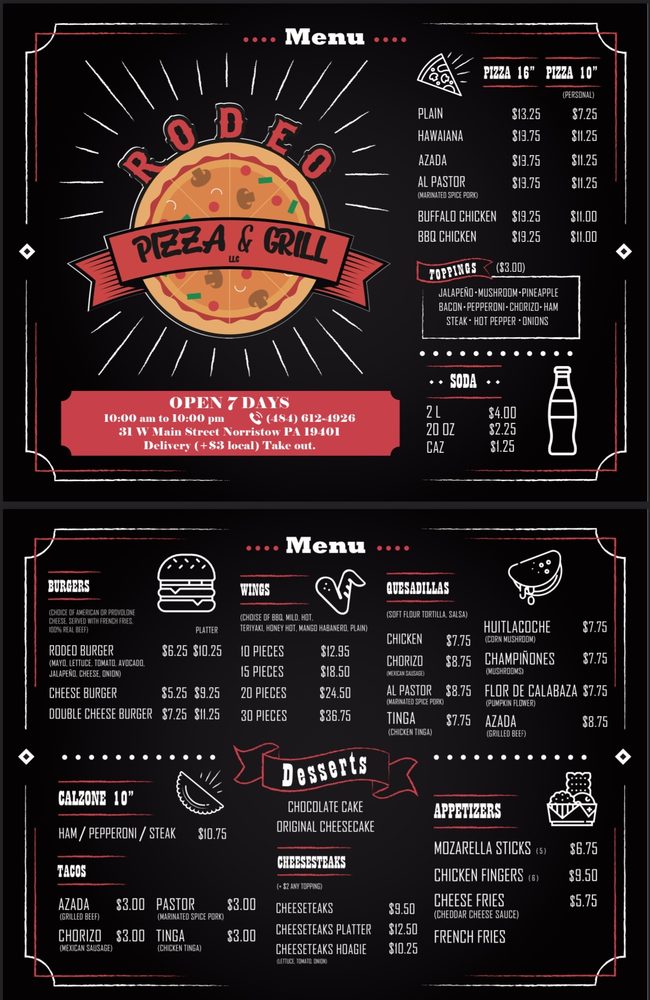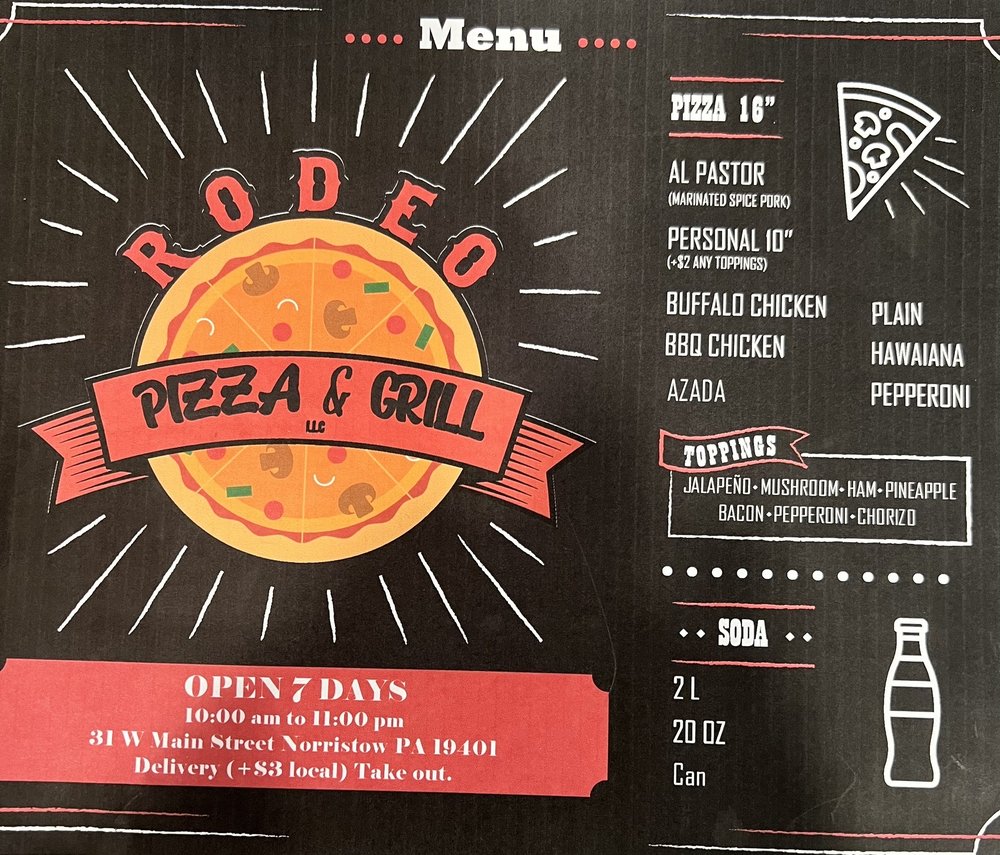 Rodeo Pizza & Grill is a distinctive culinary gem nestled in the vibrant food scene of Norristown, Pennsylvania, steeped in rich Mexican heritage. Operating in the restaurants category, this establishment goes beyond the typical dining experience to offer a delectable blend of Mexican ethnicity and American comfort food. Its menu is a flavorful testament to its unique ethos, boasting a variety of pizzas and grilled delights, each dish infused with authentic Mexican spices and ingredients, representing the ethnic tribe of Mexico, and catering to a diverse range of palates. At Rodeo Pizza & Grill, customer experience is paramount. Patrons are welcomed into a warm, inviting atmosphere where the aroma of freshly baked pizza and sizzling grill items fill the air. The staff are renowned for their hospitality, ensuring each guest feels at home while enjoying their meal. While it may not hold historical significance in the traditional sense, Rodeo Pizza & Grill is certainly engraving its own history in the hearts of the Norristown community. With its commitment to providing quality food in a cozy ambiance, it serves as a lively gathering spot for friends, family, and food enthusiasts alike. In serving the community, Rodeo Pizza & Grill goes a step further, linking the local populace with the vibrant flavors of Mexico, while fostering a sense of unity and appreciation for diverse culinary traditions.