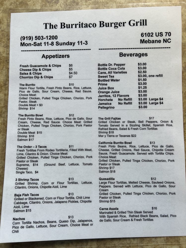 The Burritaco Burger Grill, nestled in the heart of Mebane, North Carolina, offers a unique blend of cuisine that tantalizingly marries Mexican tradition with classic American comfort food. Renowned in the restaurant industry, this establishment takes pride in its special association with the ethnic tribes of Mexico, infusing its menu with authentic flavors and recipes passed down from generation to generation. The Burritaco Burger Grill stands as a beacon of culinary creativity, offering patrons an exciting fusion of burritos and tacos with the hearty satisfaction of a juicy, grilled burger. The dining experience goes beyond the plate, with a warm, convivial ambiance that invites customers into a vibrant celebration of shared heritage and diverse cuisine. Although the restaurant does not boast a long history, it has quickly established itself as a community hub. It serves as a platform for cultural exchange, fostering a deeper appreciation for Mexican traditions among the broader population while providing a taste of home for those of Mexican descent. This commitment to community and cultural preservation, coupled with its innovative food offerings, sets The Burritaco Burger Grill apart in the bustling American restaurant landscape. From the moment you step into The Burritaco Burger Grill, you're not just a customer - you're part of the familia.
