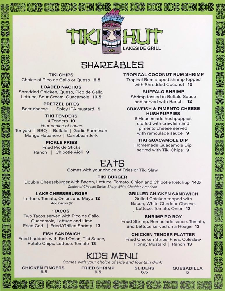 Nestled beside a tranquil lake, Tiki Hut Lakeside Grill offers an idyllic dining setting that blends natural beauty with a charming, laid-back Tiki hut environment. The design of the restaurant pays homage to the Mexico ethnic tribe's culture, creating an inviting atmosphere that promotes relaxation and enjoyment. This enchanting setting, combined with the restaurant's commitment to providing quality food and exceptional service, makes Tiki Hut Lakeside Grill a sought-after destination for both locals and tourists. Whether you're planning a romantic dinner, a family gathering, or just craving a delightful Mexican meal, the Tiki Hut Lakeside Grill promises an unforgettable dining experience. Their online presence makes it easy for customers to explore the menu, make reservations, and even order online for those preferring to savor their meals at home. With its unique fusion of culture, cuisine, and lakeside charm, Tiki Hut Lakeside Grill truly stands as a beacon of culinary excellence in the U.S. restaurant landscape.